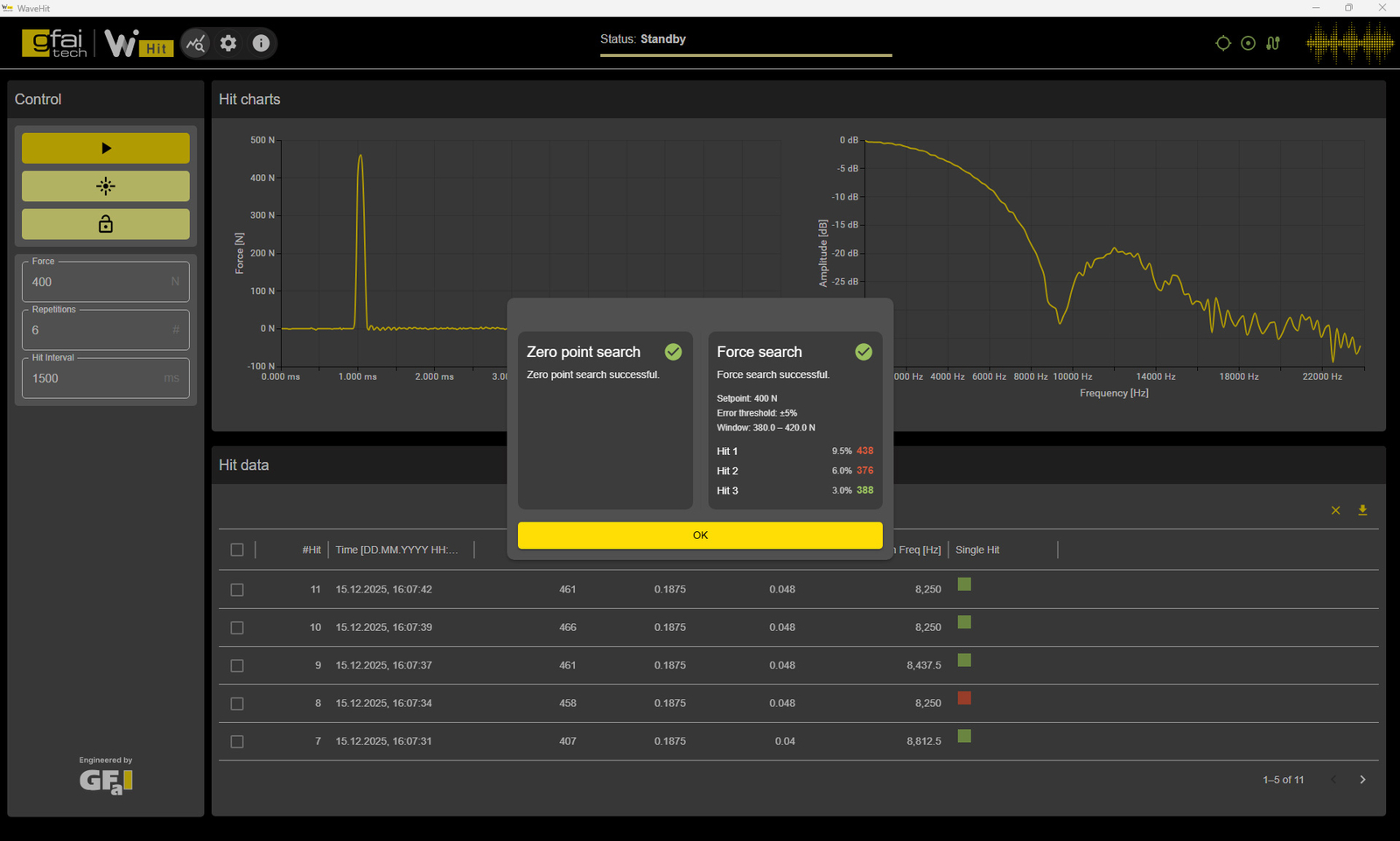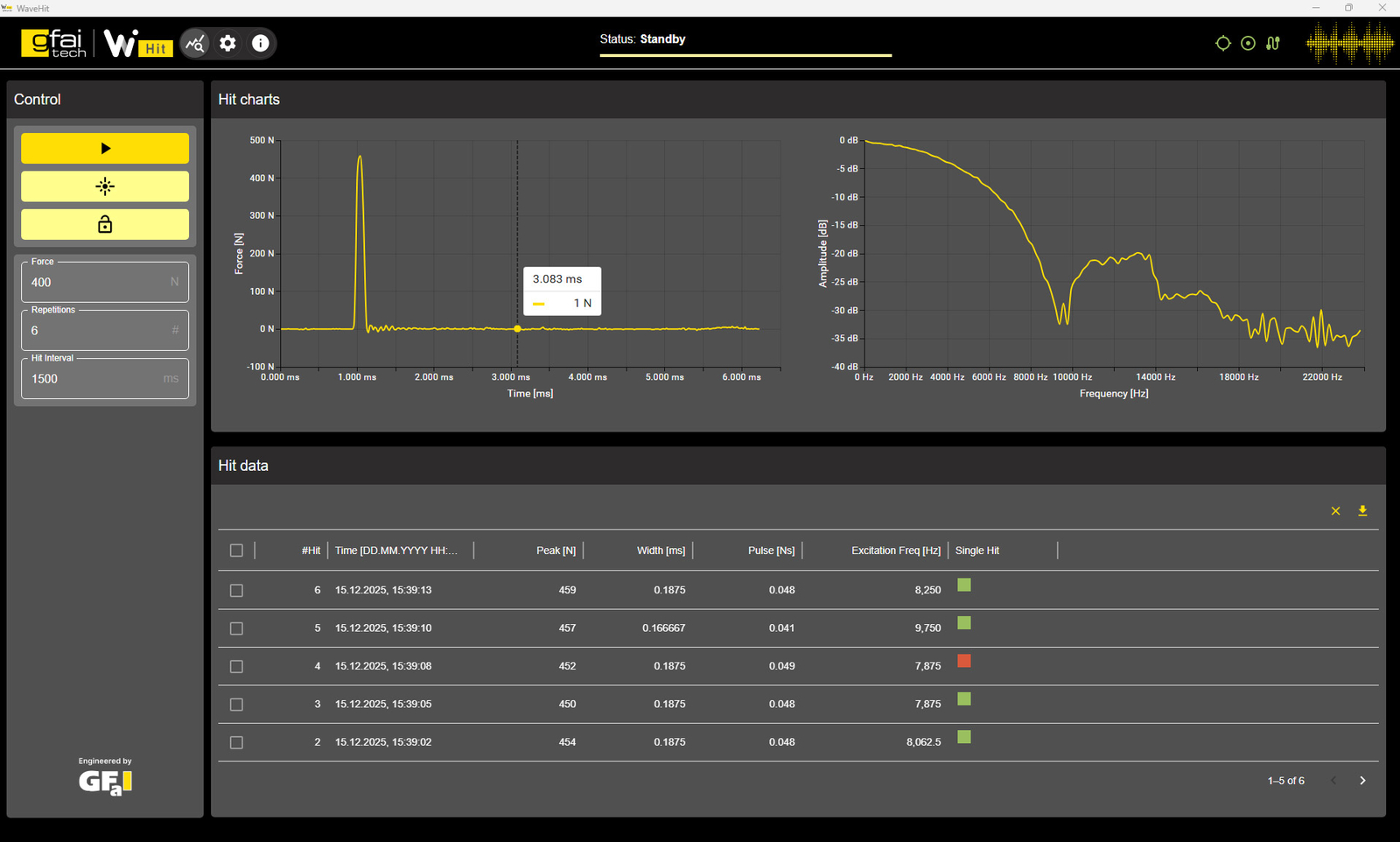 Die im Lieferumfang enthaltene Software WaveHit ermöglicht die vollständige Steuerung und Parametrierung des Impulshammers über eine intuitive Benutzeroberfläche. Zu den Funktionen gehören unter anderem die automatische Verbindung über Ethernet, die Durchführung einer vollautomatischen Kalibrierung (bei MK2-Modellen), sowie die Live-Klassifikation der Einschläge inklusive Single-Hit-Erkennung im LDV-Modus. Zusätzlich bietet die Software eine Exportfunktion im CSV-Format zur Weiterverarbeitung der Messdaten in externen Analyseumgebungen.