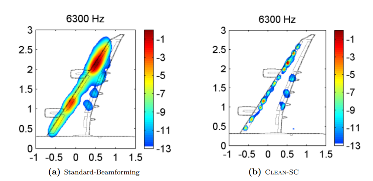 CLEAN-SC minimizes the influence of the PSFs on the acoustic map. Because of its significant improvements, it is commonly used for beamforming investigations in the frequency domain. The algorithm performs less well in the case of measurements in wind tunnels or outdoor measurements at large distances from sources because of a coherence loss. Furthermore, calculation errors might occur if the resolution and/or image field are not chosen adequately. As a consequence, potential maxima cannot be identified correctly.